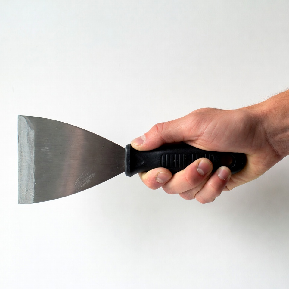 A person holds a metal scraper tool in their right hand. The background is plain, and the focus is on the tool's blade and handle.