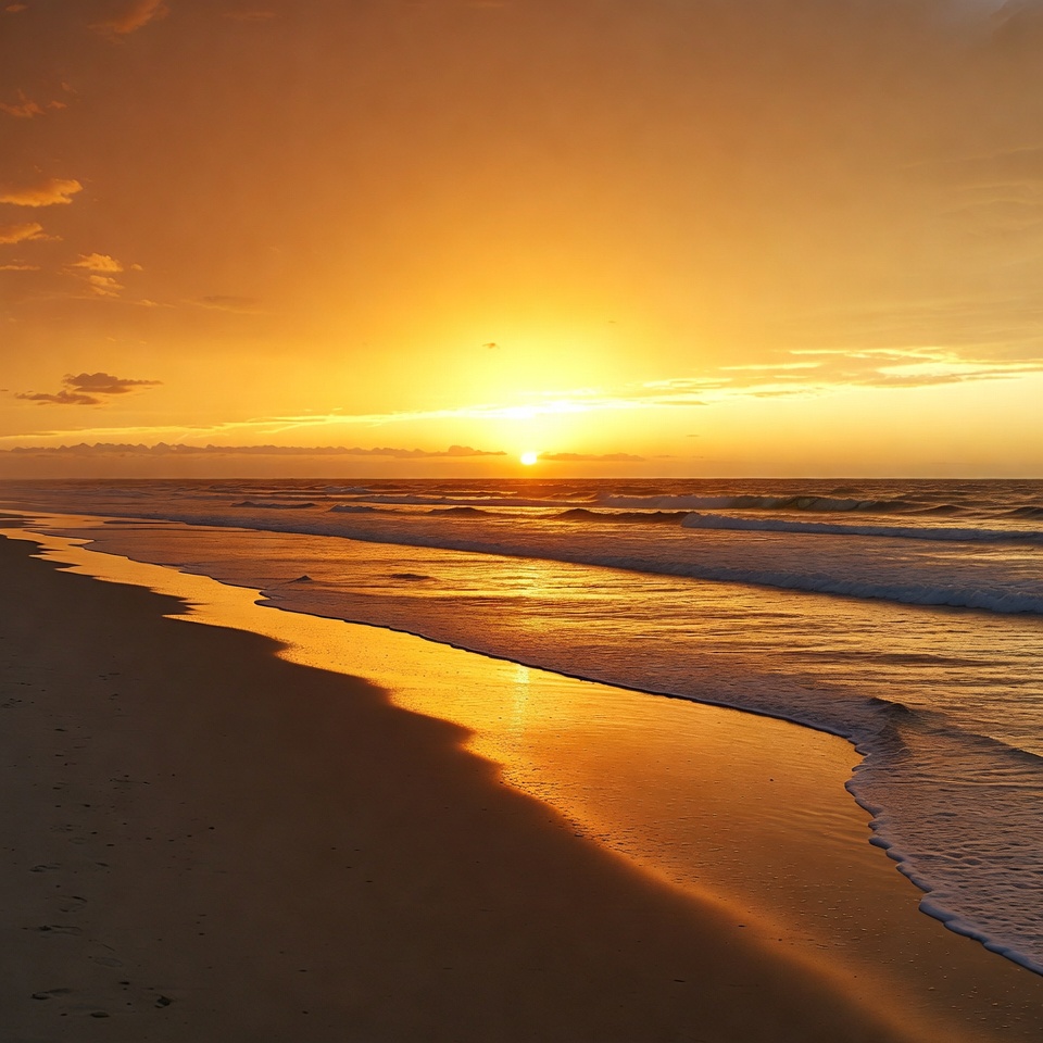 Waves gently touch the shore as the sun sets on the horizon, casting orange and gold hues across the sky and water.