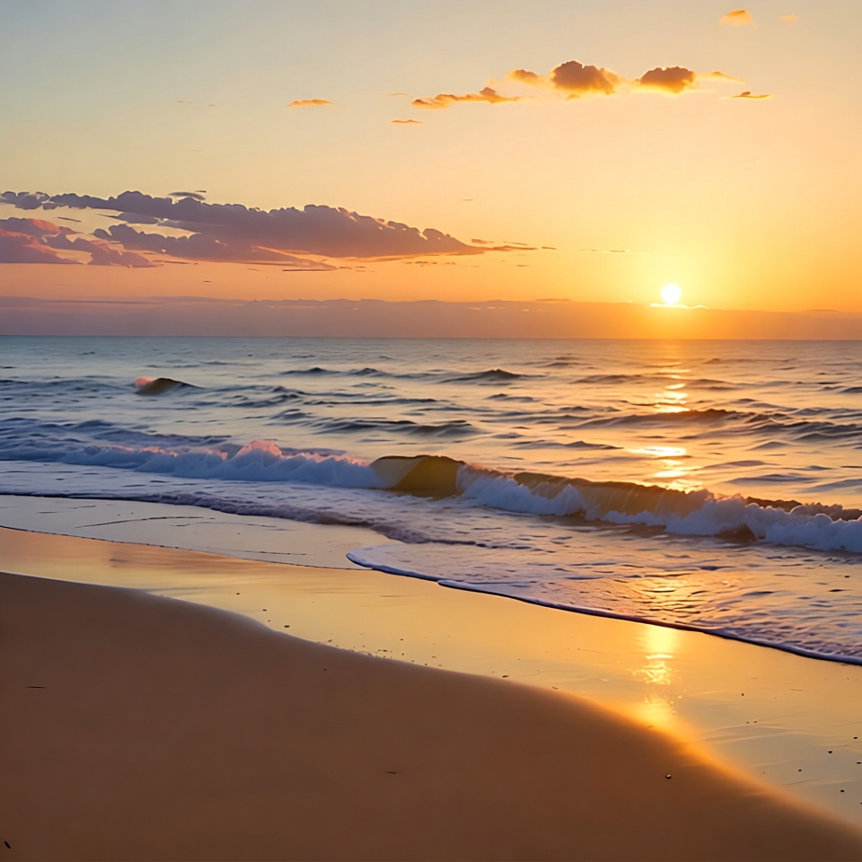 Waves crash on the shore as the sun sets on the horizon, creating a colorful sky and reflecting light on the water surface.