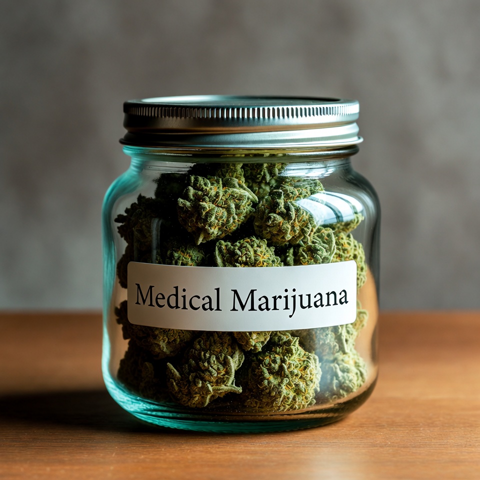 Medical marijuana jar on table