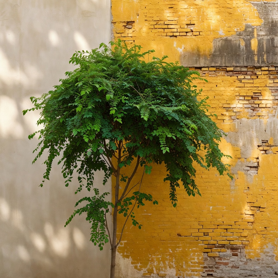 A green tree stands next to a textured yellow wall. The setting is in an urban area during daylight hours.