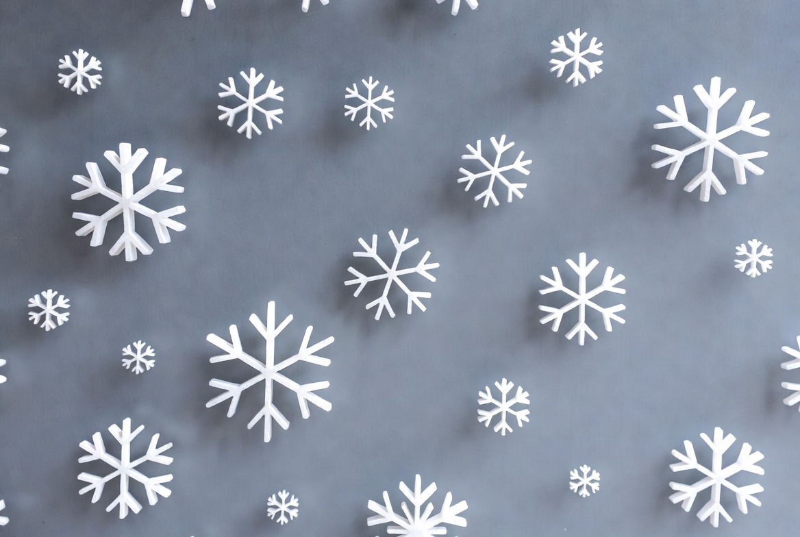 Snowflakes of various sizes are spread across a gray surface, creating a simple winter scene with a focus on seasonal shapes.