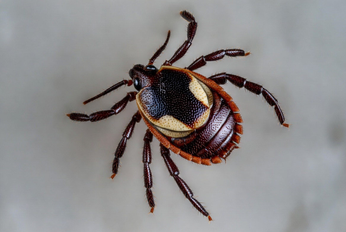 A tick rests on a light surface, showing its dark body and distinctive markings. It crawls slowly as it searches for a host.