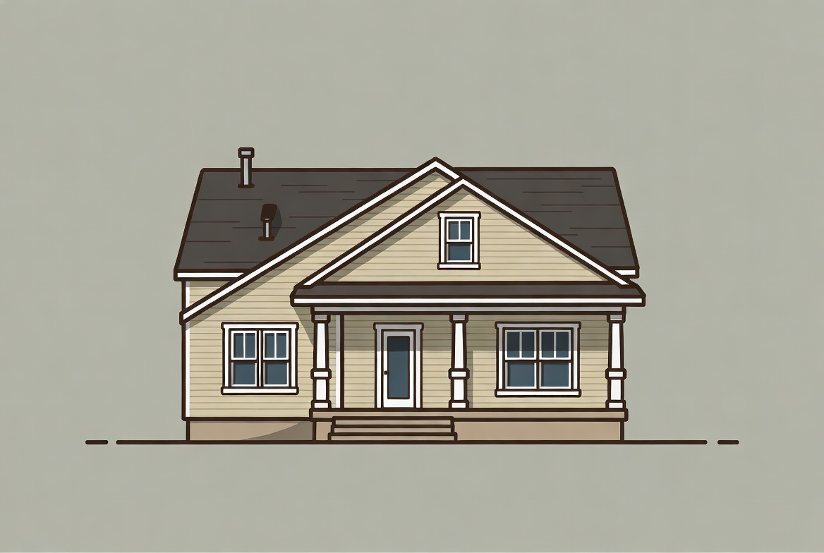 A house is shown with a front porch, windows, and a chimney in a simple architectural style against a plain background.