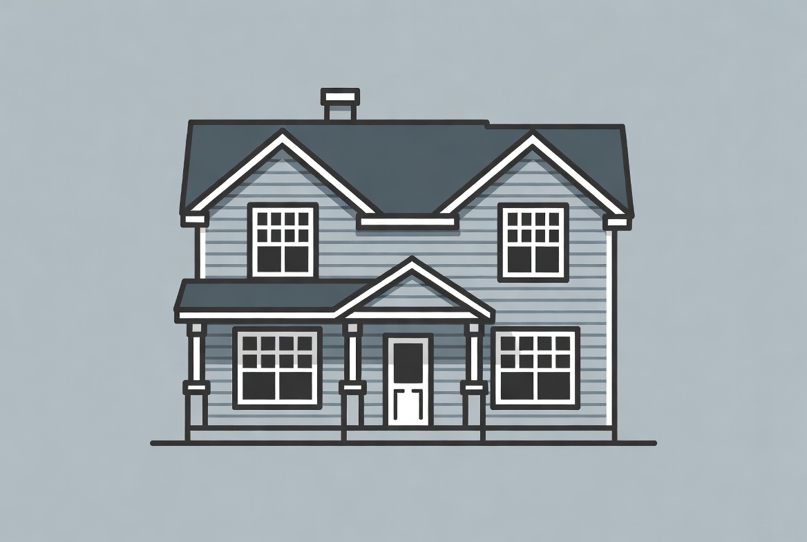 A simple drawing shows a two-story house with a front porch, windows, and a chimney. It has a gray exterior and a stark background.