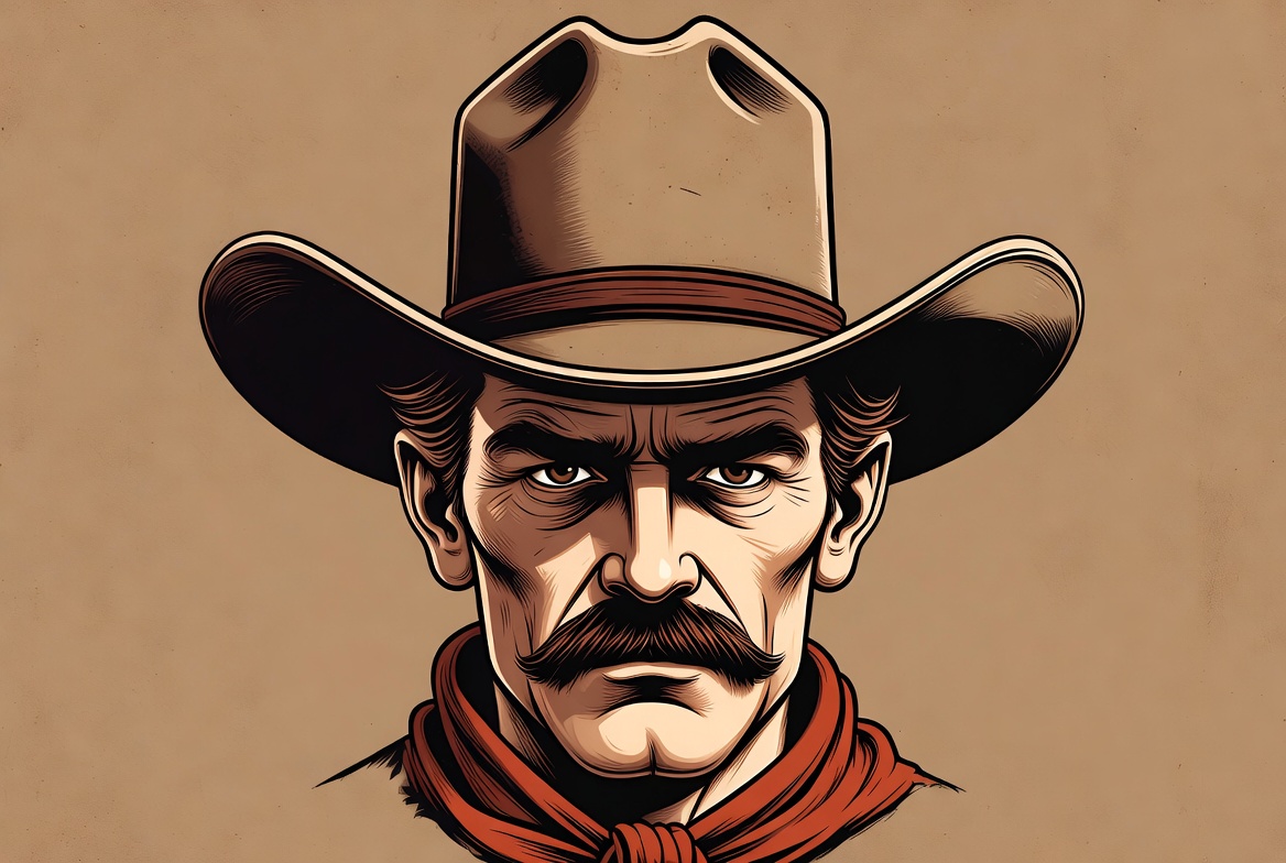 art, bandana, character, cowboy, drawing, expression, face, hat, illustration, male, mustache, portrait, rugged, serious, strong, style, traditional, vintage, western, western wear