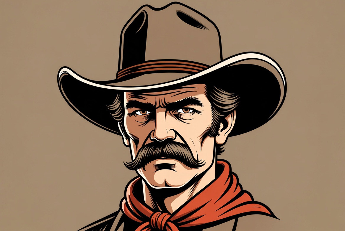 Americana, bandana, character, country, cowboy, facial expression, facial hair, hat, hero, male, man, mustache, old west, portrait, rugged, serious, style, vintage, western, wild west