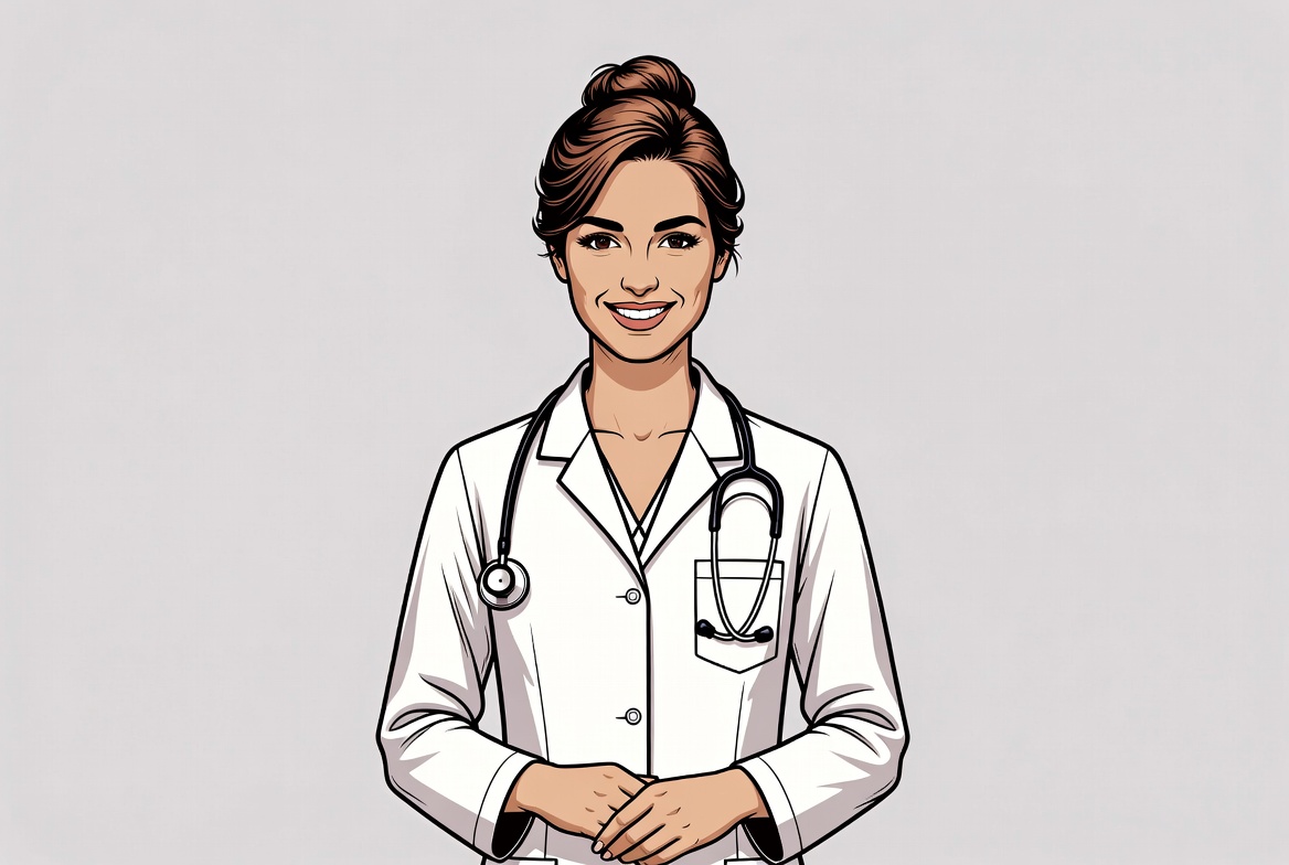A woman stands smiling while wearing a white coat and stethoscope, ready to assist patients in a medical setting.