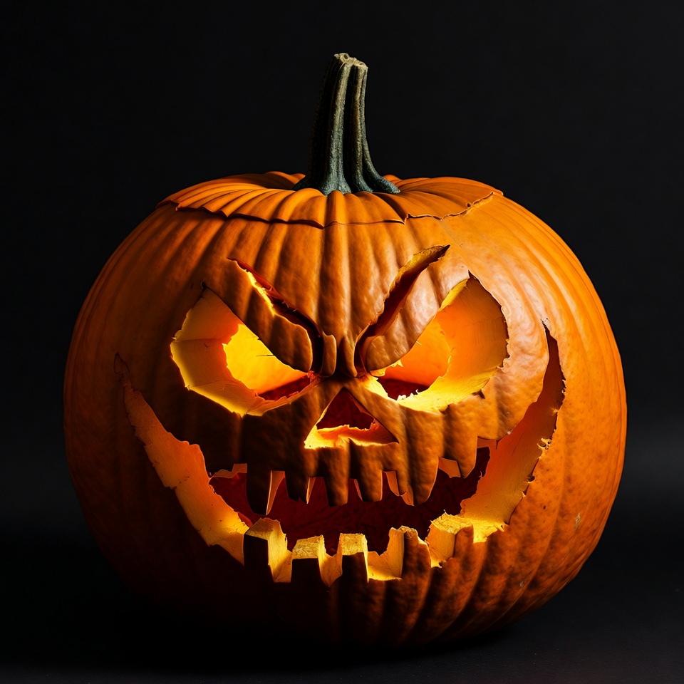 A carved pumpkin with a scary face is lit from within, displaying glowing eyes and jagged teeth. This decoration is popular during Halloween.