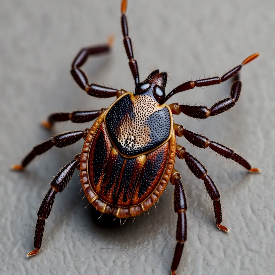 A tick crawls on a smooth surface, showcasing its detailed body structure and colors. It appears to be searching for a host.