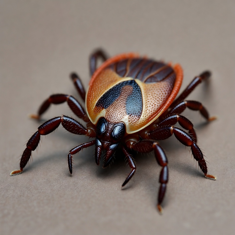 A tick is shown in detail on a flat surface. The tick's body has a distinct shape and pattern.