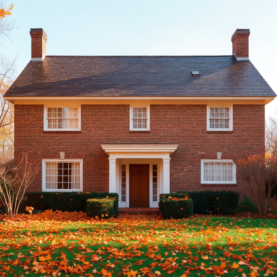 A red brick house stands in autumn with orange leaves covering the ground. Trees surround the house, creating a seasonal scene.