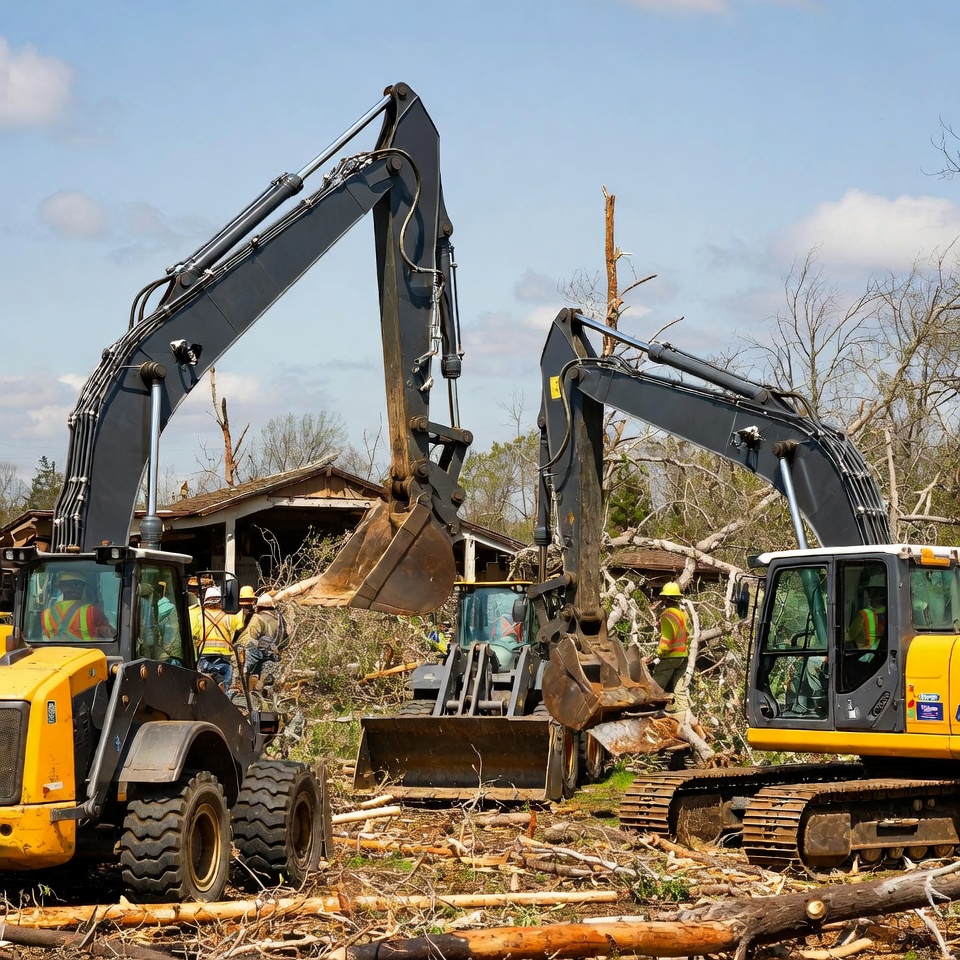 clearing, construction, construction site, debris removal, earth moving, equipment, excavators, ground, heavy machinery, landscape, machinery, operation, process, recovery, restoration, rural area, site work, storm damage, trees, workers