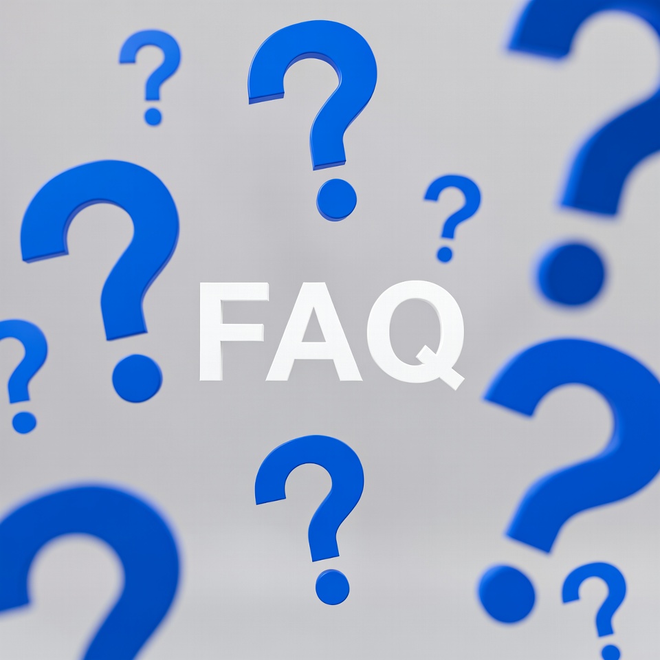 Various blue question marks surround the word FAQ on a gray background. This scene suggests a focus on inquiries and explanations.