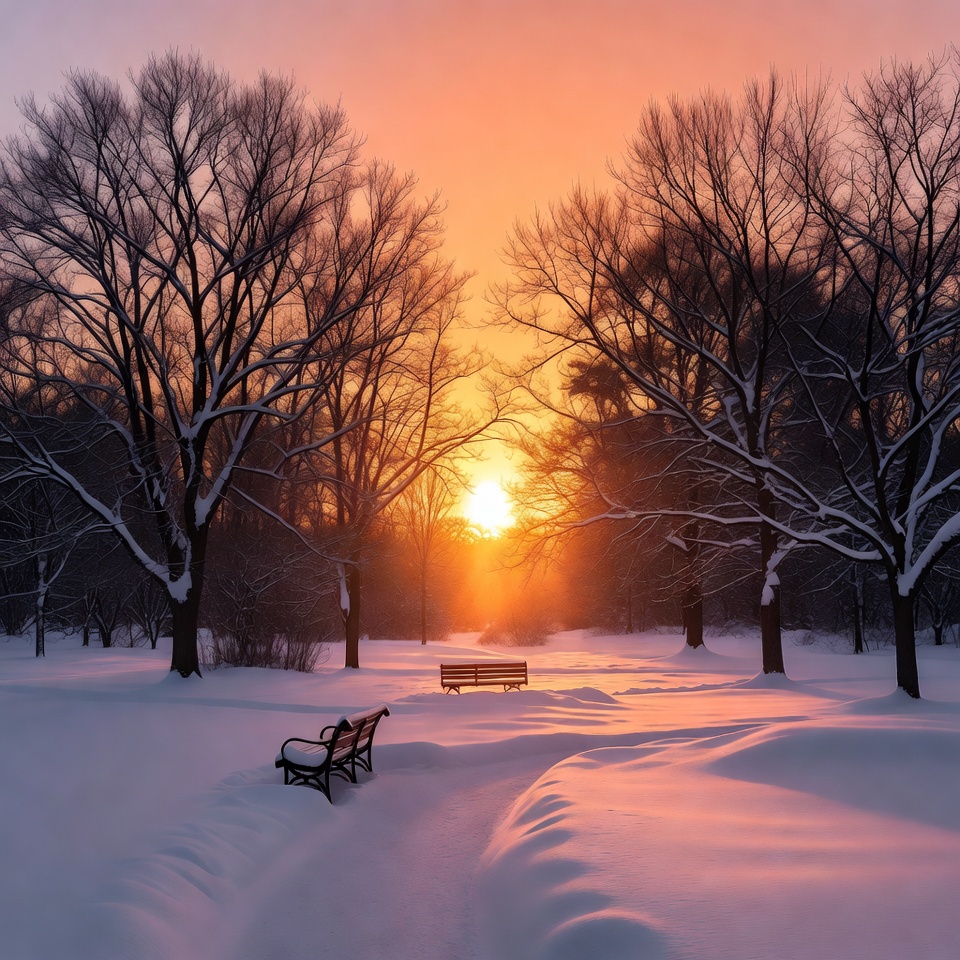 Sun sets behind trees in a snowy park. A bench sits quietly as snow covers the ground, with footprints leading into the distance.
