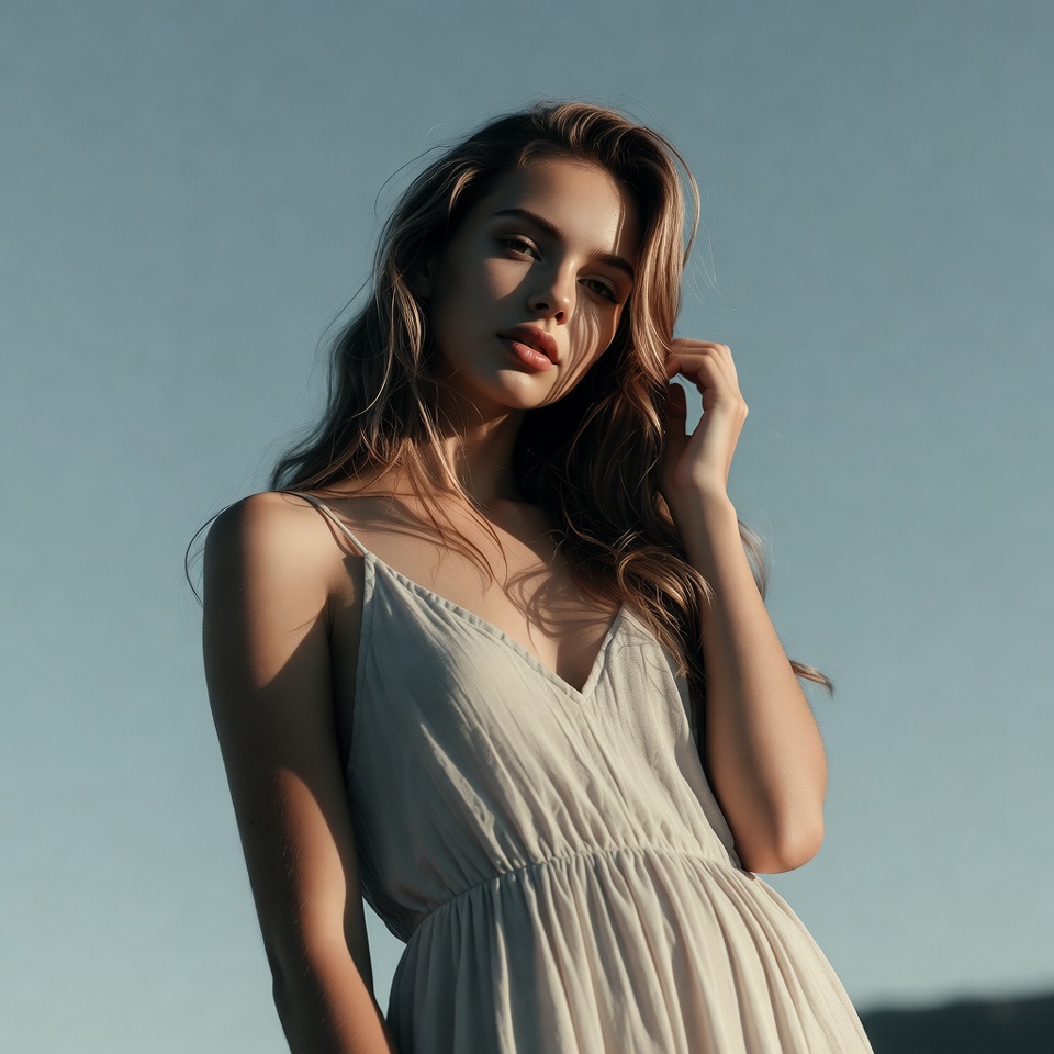 Young woman poses outside with sunshine highlighting her features. She is wearing a light dress while touching her hair against a clear sky.