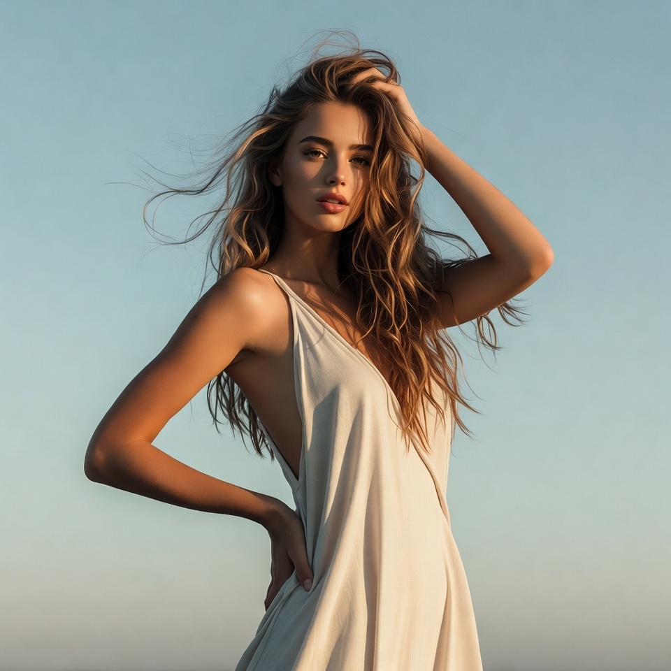 A woman stands on the beach with wind blowing through her hair as the sun sets. She looks confidently at the camera, creating a striking scene.