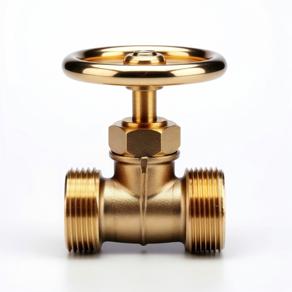 A brass water valve with a round handle is displayed against a white background. The valve shows details of design and fittings for pipes.