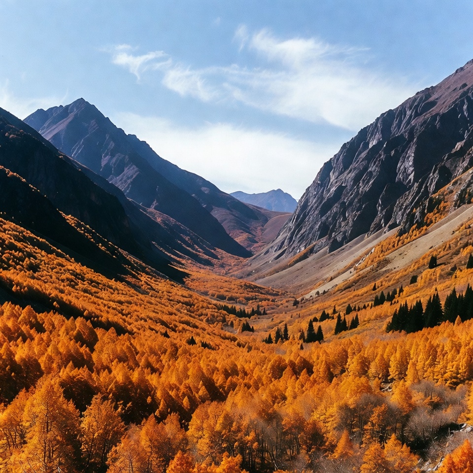 Bright orange trees fill the valley between mountains under a clear blue sky. Autumn season showcases nature's colors in this outdoor scene.