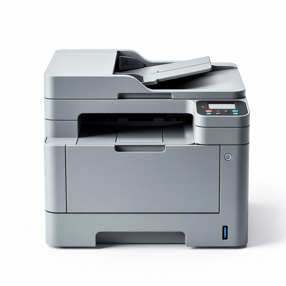 A printer is placed on a flat surface. It is ready for printing or scanning documents. The device shows a digital display and buttons.