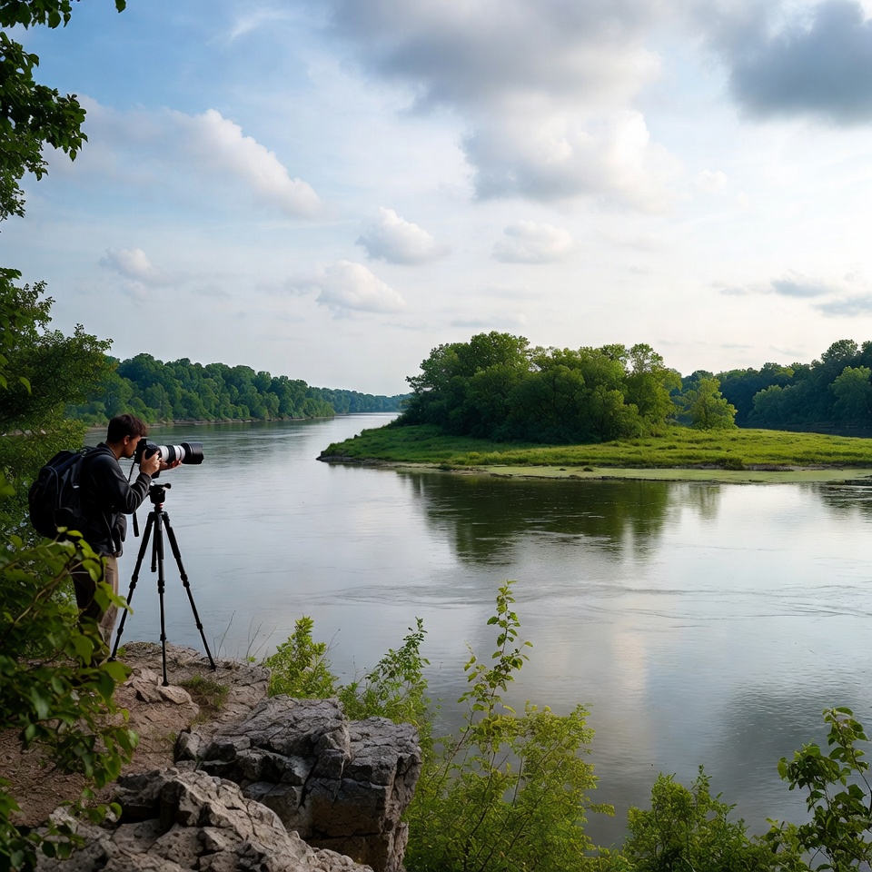 camera, capture, equipment, evening, green, hobby, landscape, ledge, local, nature, outdoors, photographer, river, riverbank, scene, scenic, trees, tripod, water, wildlife