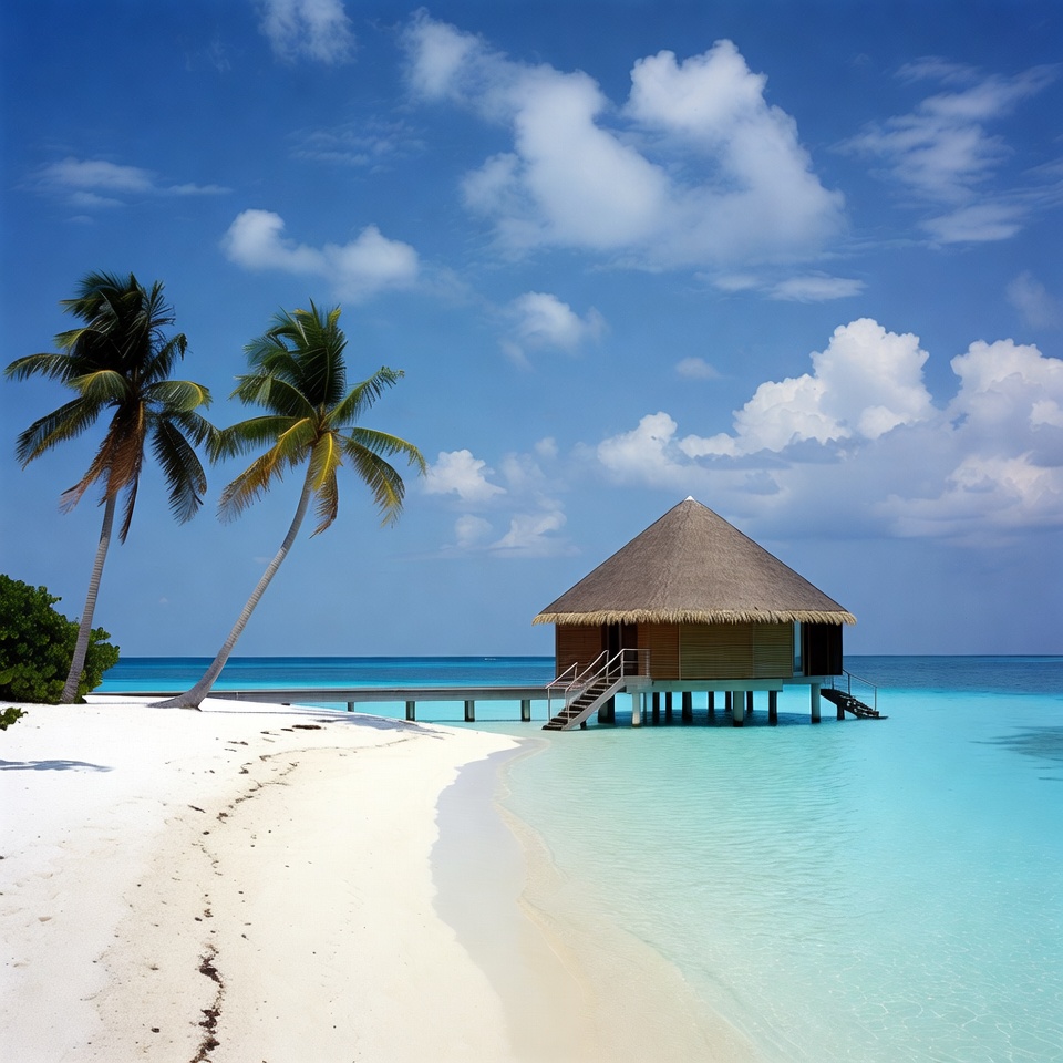 A beach hut stands on stilts over clear water. Palm trees frame the scene under a blue sky filled with clouds.