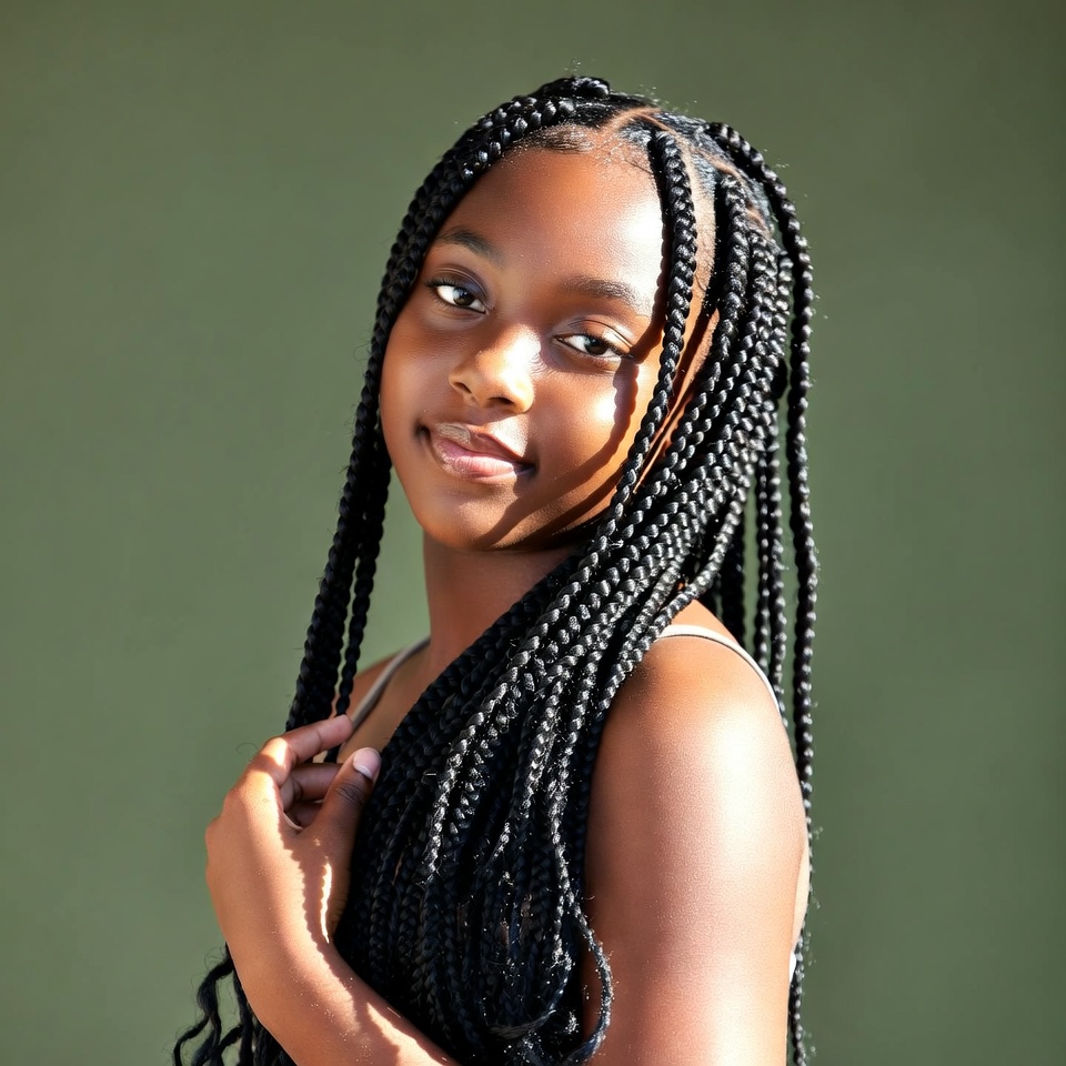 beauty, braids, childhood, confidence, cultural hairstyle, direct gaze, girl, girlhood, green background, hair, hairstyle, natural light, playful, portrait, posing, simple expression, skin tone, smile, sunlight, youth