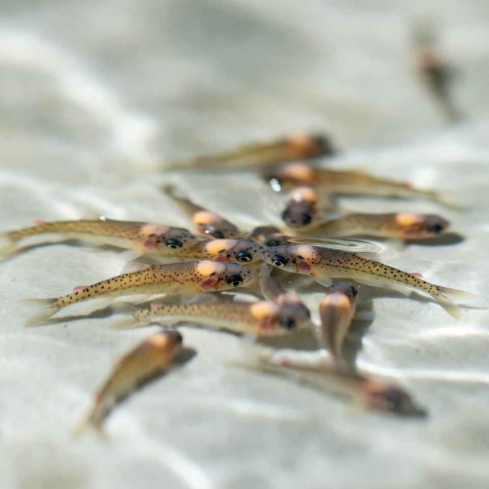 Small fish swim together in clear, shallow water, creating a pattern as they move. The setting is natural and filled with motion.