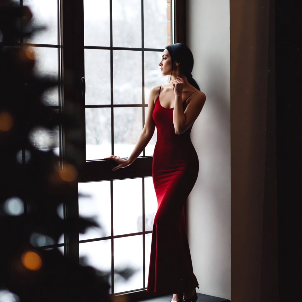 A woman stands by the window wearing a red dress. Snow falls outside as she looks out. The scene is cozy and warm indoors.