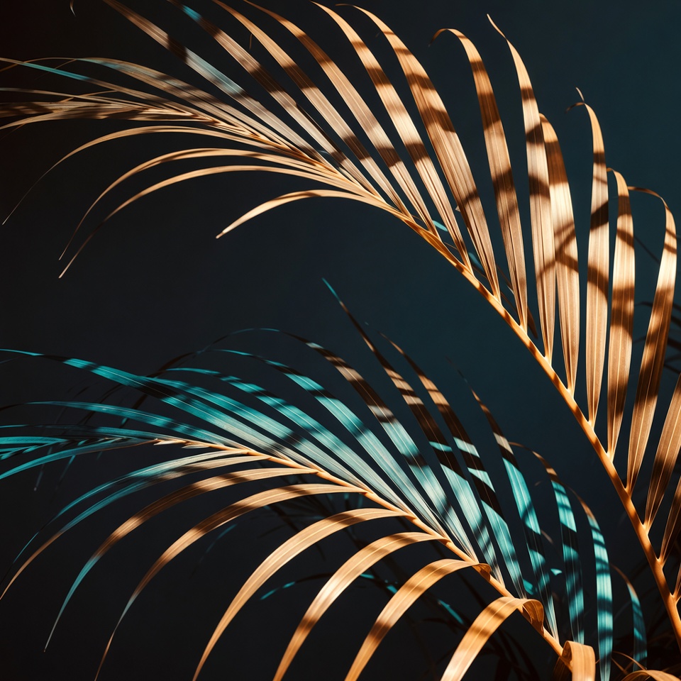 Palm leaves cast shadows on a dark background, showing the interplay of light and artful patterns. The scene captures nature's design.