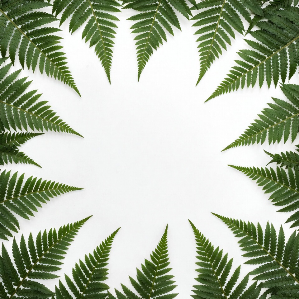 Ferns are placed in a circular pattern on a white surface. The leaves create a frame around the empty center, showing green colors clearly.