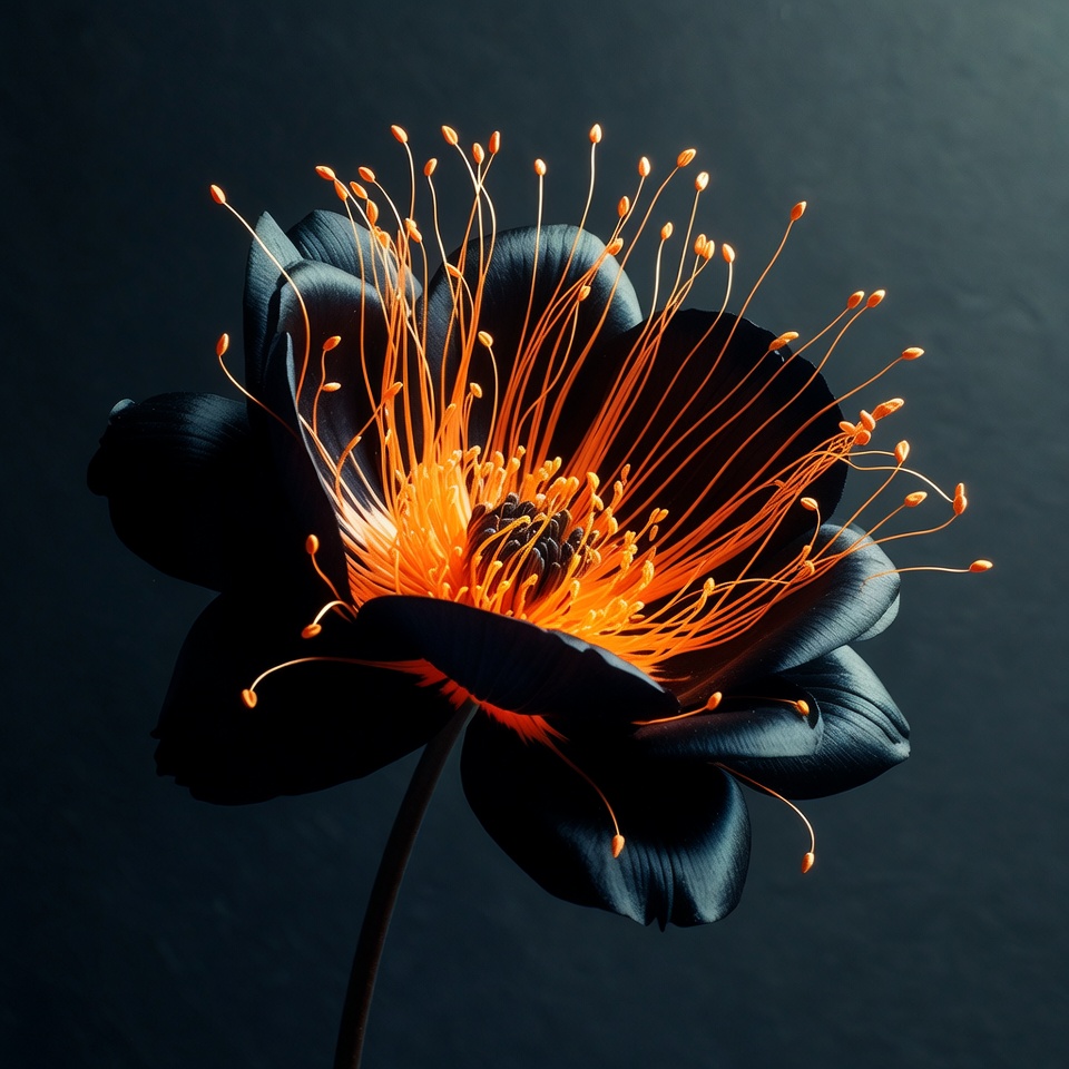 Black flower with orange details in dark setting