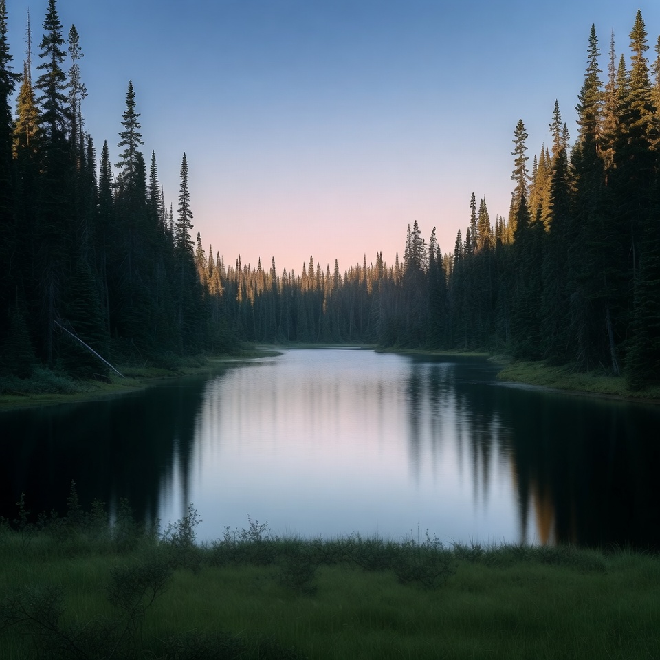 A lake reflects trees and twilight sky as the day ends. The water is still and the surroundings are calm and natural in this forest scene.