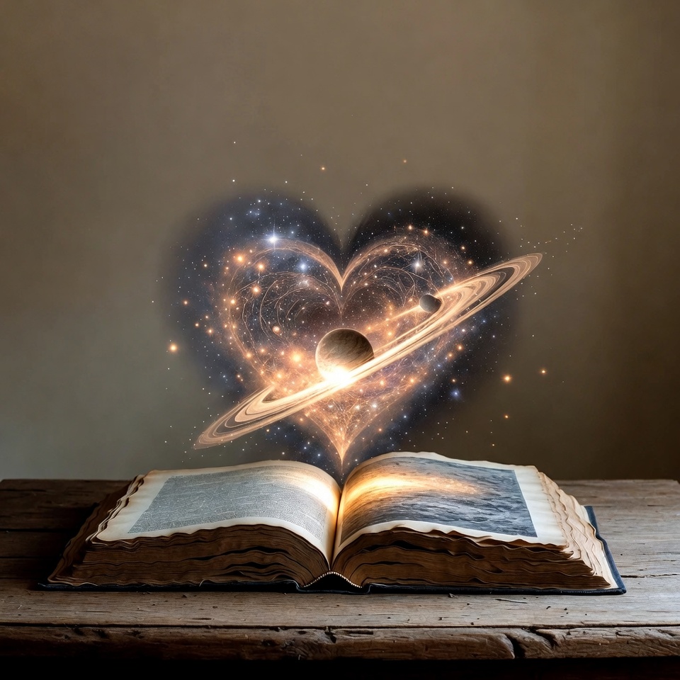 An open book sits on a table with a heart-shaped design made of stars and a planet above it. The setting looks creative and imaginative.