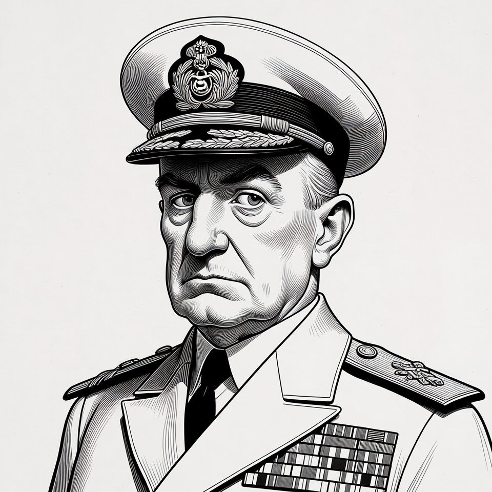 A military officer stands confidently, wearing an official uniform with various ranks and medals on display, showcasing authority and discipline.