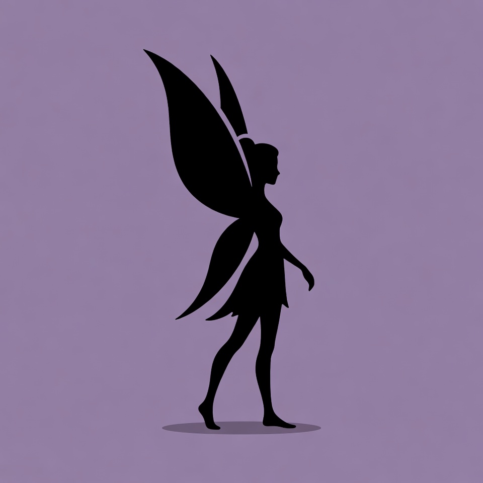 A fairy with large wings walks on a purple background. The silhouette shows detailed wing shapes and graceful posture.