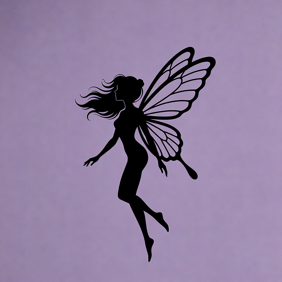 A black silhouette of a fairy is floating against a purple background. The fairy has long hair and large wings.