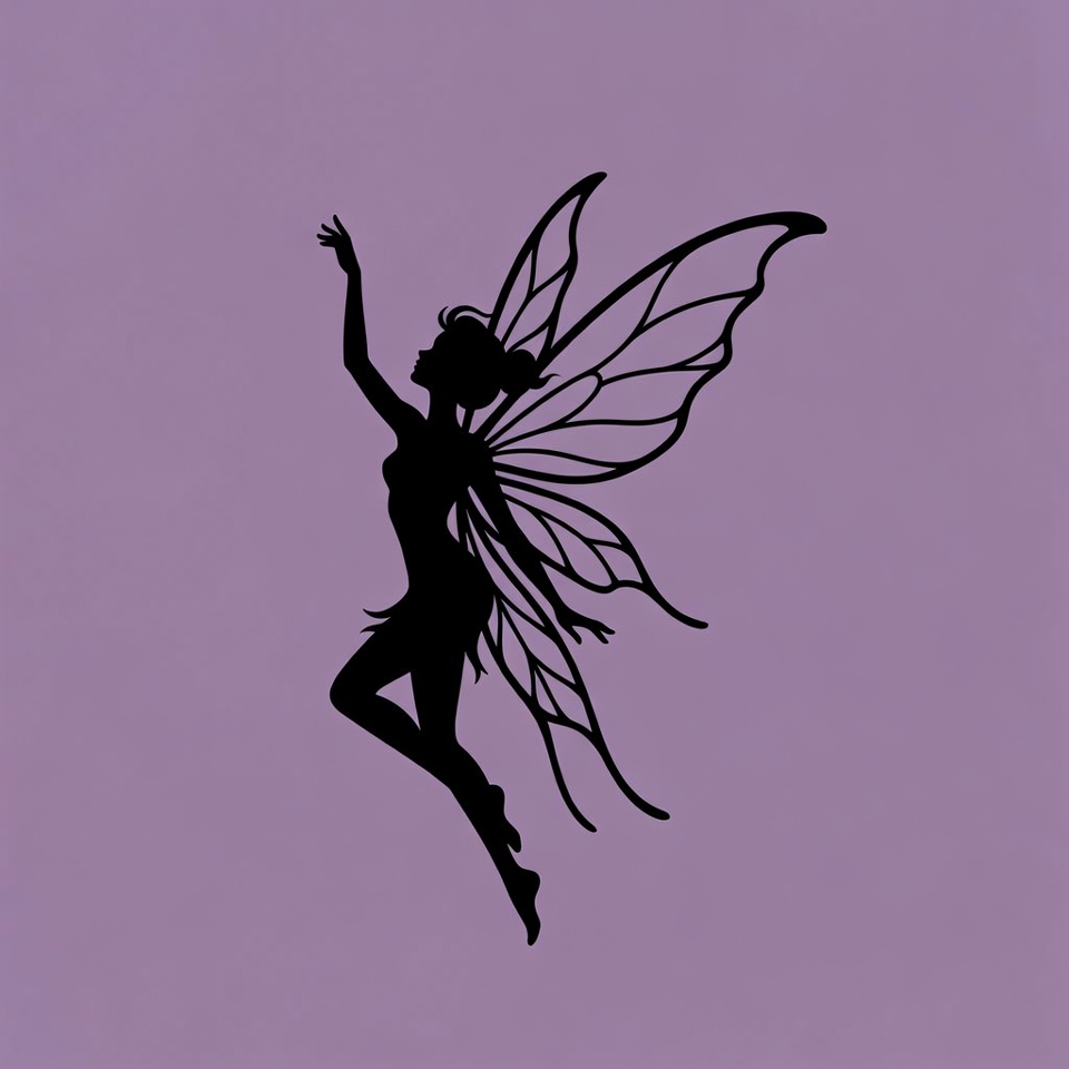A black silhouette of a fairy with wings is dancing against a plain purple backdrop. The fairy's posture shows joy and freedom.
