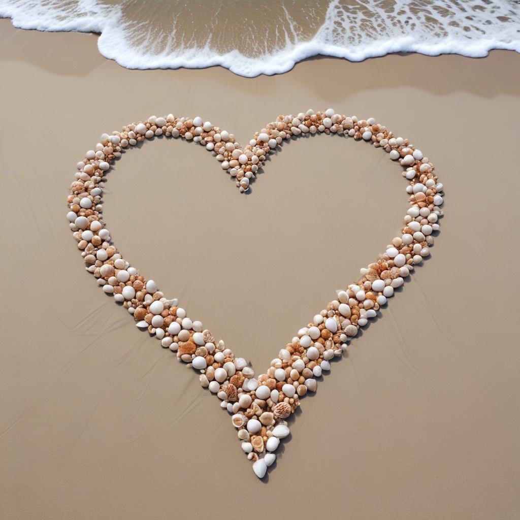 Shells form a heart shape on the sand while waves gently wash the shore. This scene captures a pleasant beach moment.