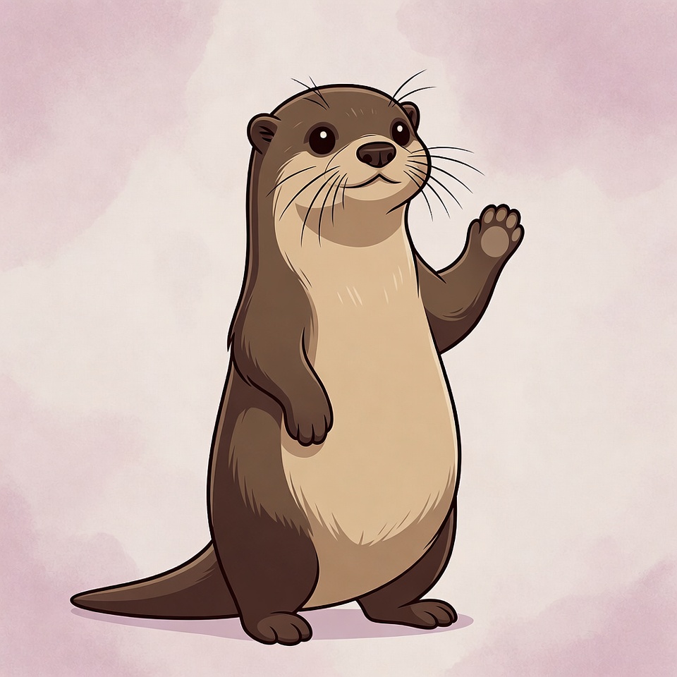 A cartoon otter is waving with its paw. It has a round body and a friendly expression. The background is soft and colorful.