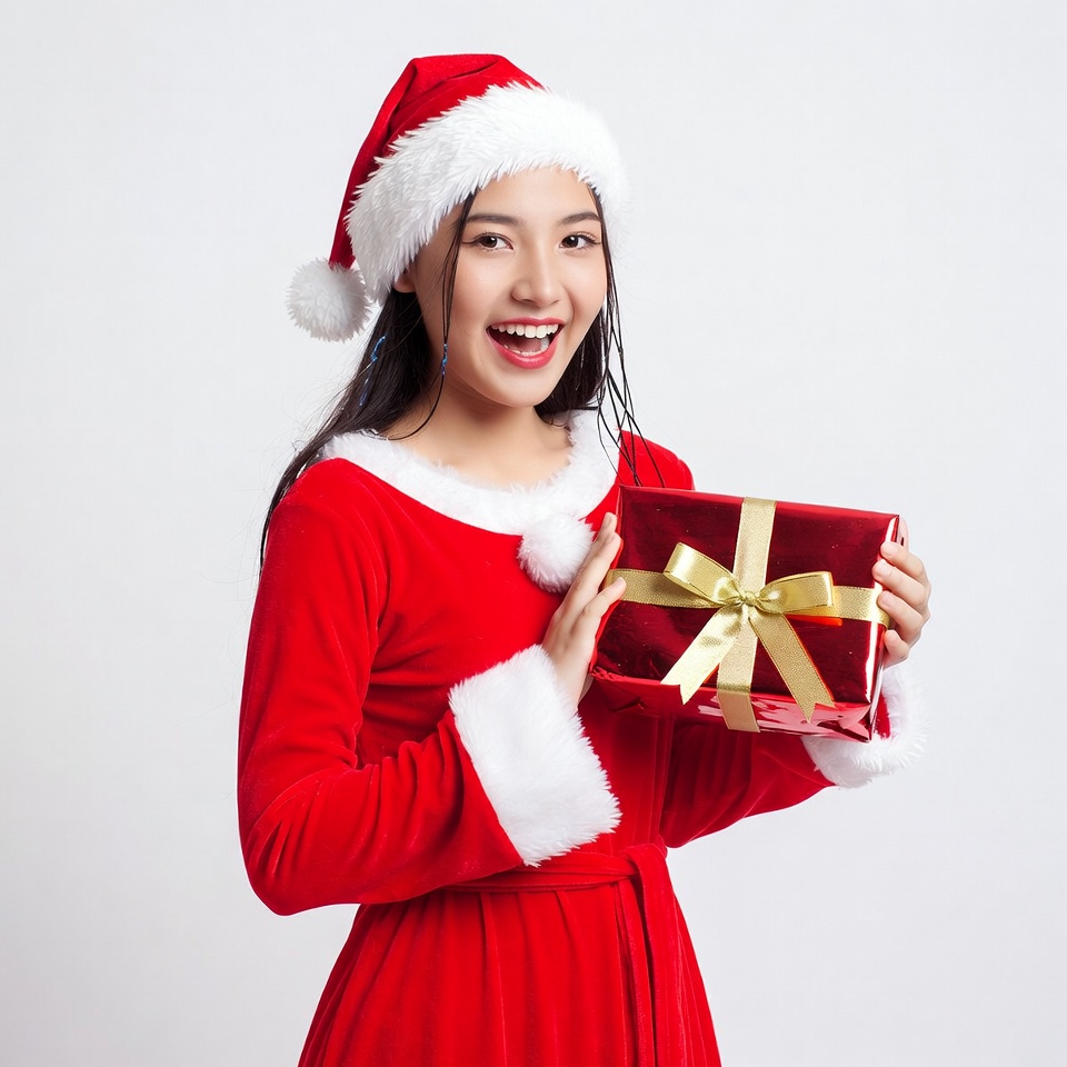 A girl wearing a Santa hat holds a red gift box with a gold ribbon. She smiles while standing against a light background.