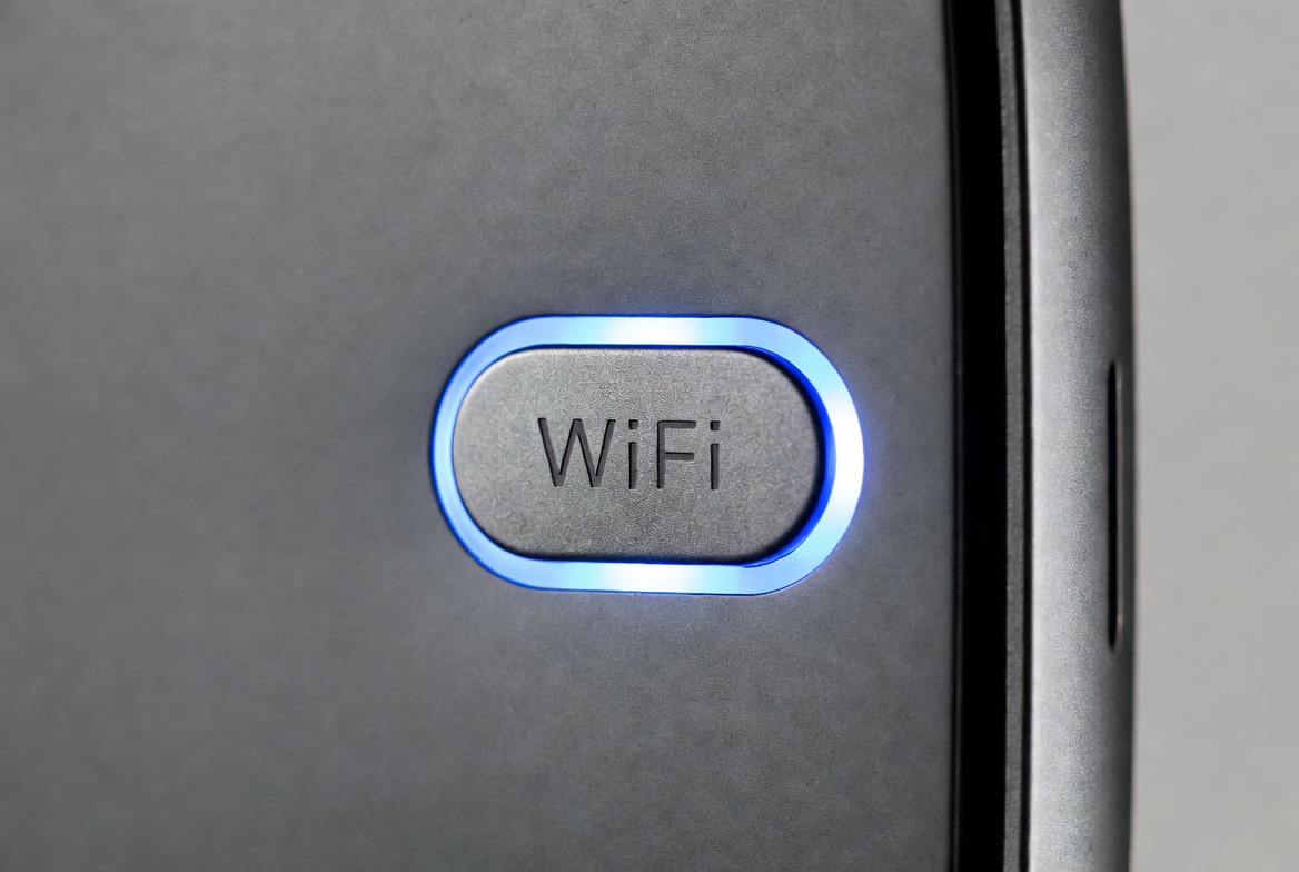 Close view of a WiFi button that is illuminated with blue light indicating that the connection is active on a device.