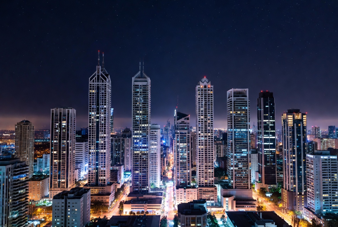 architecture, buildings, city, cityscape, downtown, exterior, high, illumination, landscape, lights, modern, night, nightime, skyline, stars, street, structure, tower, urban, view
