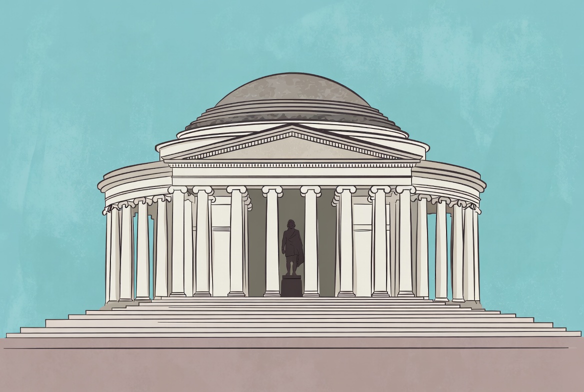 A structure stands tall with columns and a dome. A statue is visible inside the entrance. The setting has a light blue background.