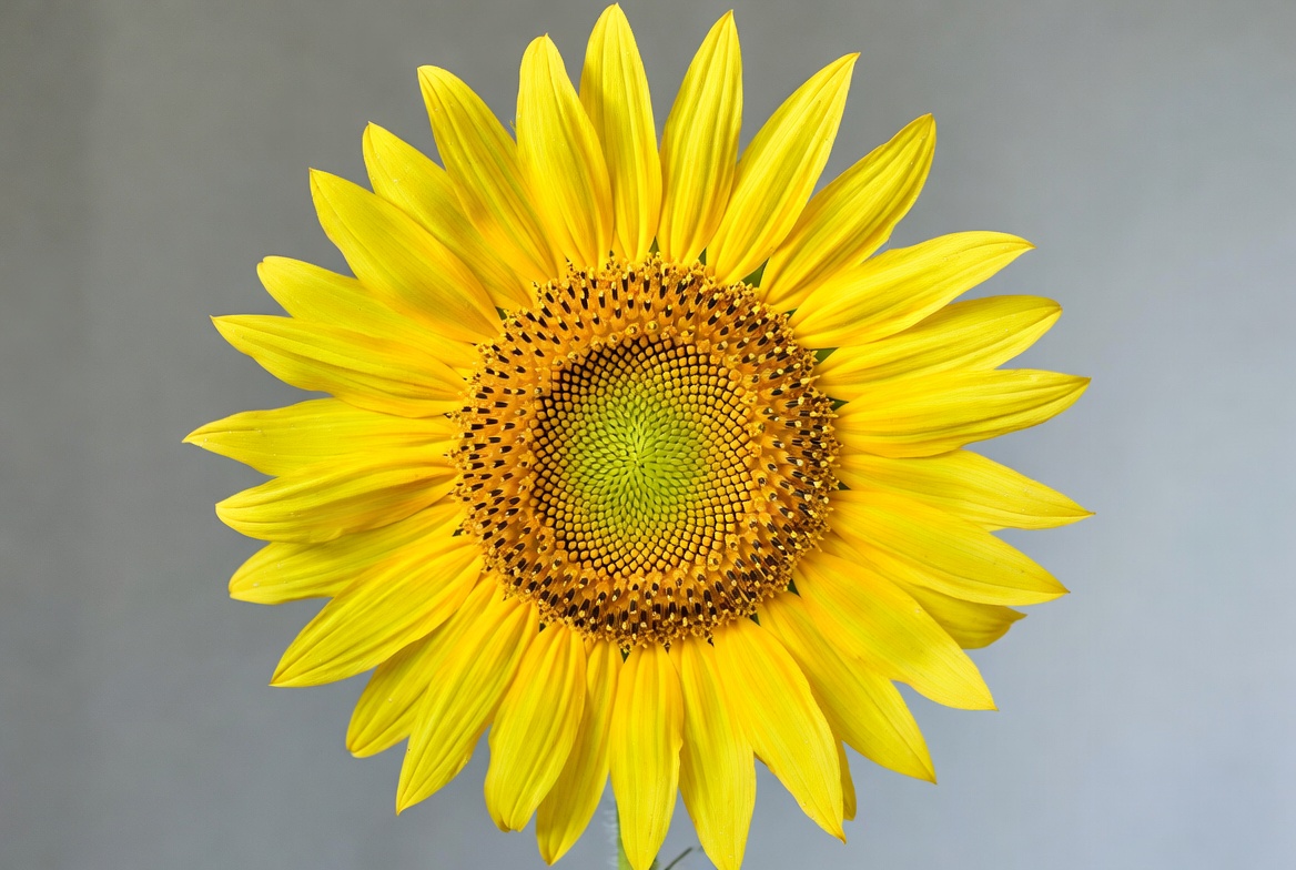 A sunflower displays its bright yellow petals and seeds during daylight. The flower stands upright in a simple background.