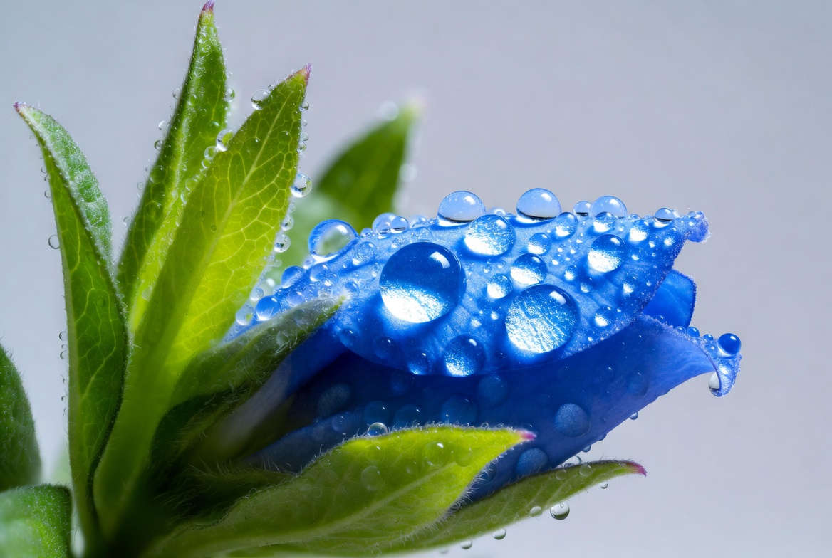 A close view of a blue flower covered in water droplets. Green leaves surround the flower on a light background.