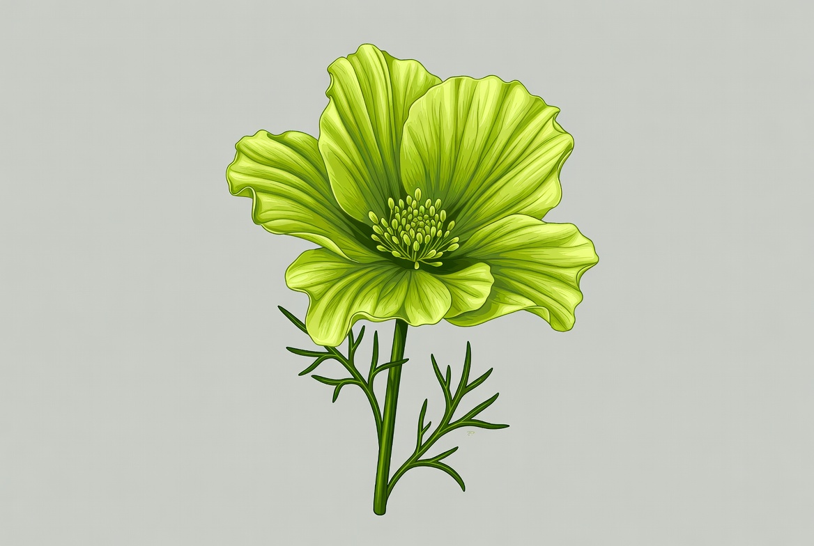 A green flower with wide petals and delicate leaves stands against a light grey background. It has fine details in its structure.