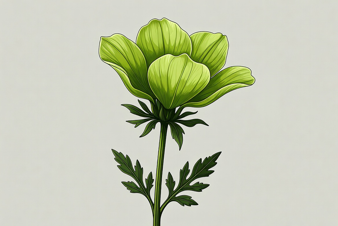 A green flower stands upright with wide petals and long leaves. The background is plain, highlighting the plant's details.