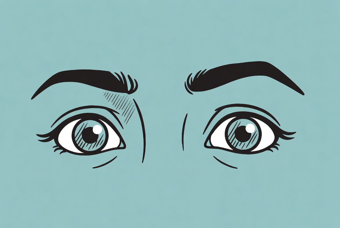 Two human eyes illustrate a simple design with clear details. The eyes show expression and depth against a solid color background.