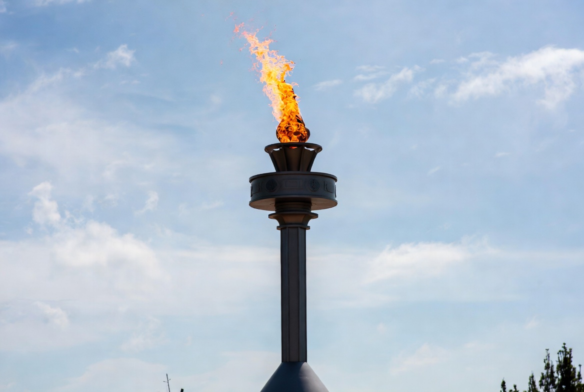 attraction, bright, burning, ceremony, city, clouds, day, fire, flame, landmark, light, metal, monument, outdoor, sky, sport, structure, symbol, torch, tourist
